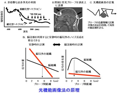 1991年、国立精神神経センターにて、光(近赤外線)を懐中電灯のように頭皮上から照らして、役割の異なる脳領域の機能的な血液反応を画像化する原理(光機能画像法、NIRS-Imaging)を発見する(図1)。表面コイルを使ったMRスペクトロスコピー, 脳画像MRI, 脳血流の分布画像SPECTの子どもの発達研究の成果、新生児・小児医療の体験が総合して,この飛躍的なアイデアが生み出された。